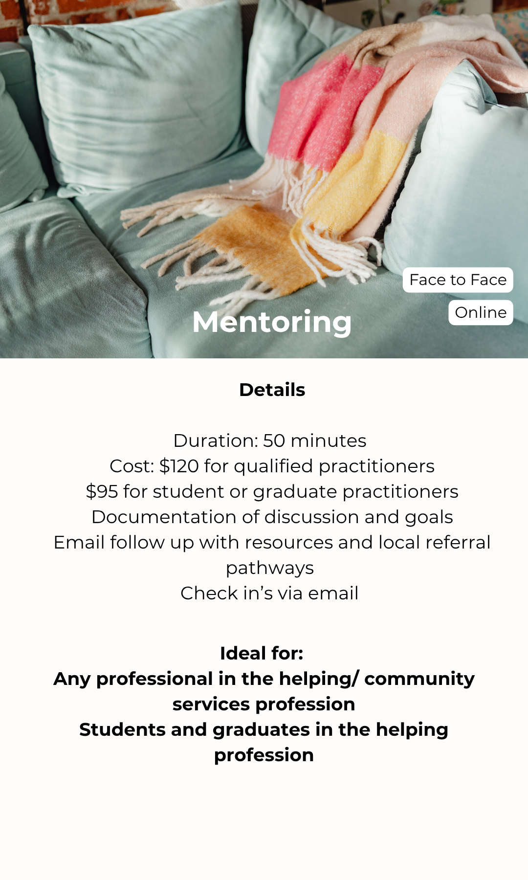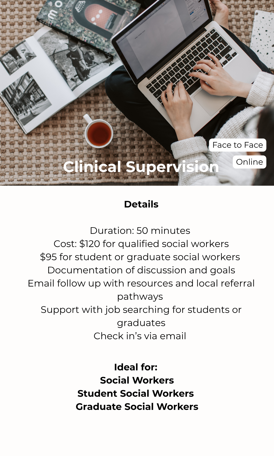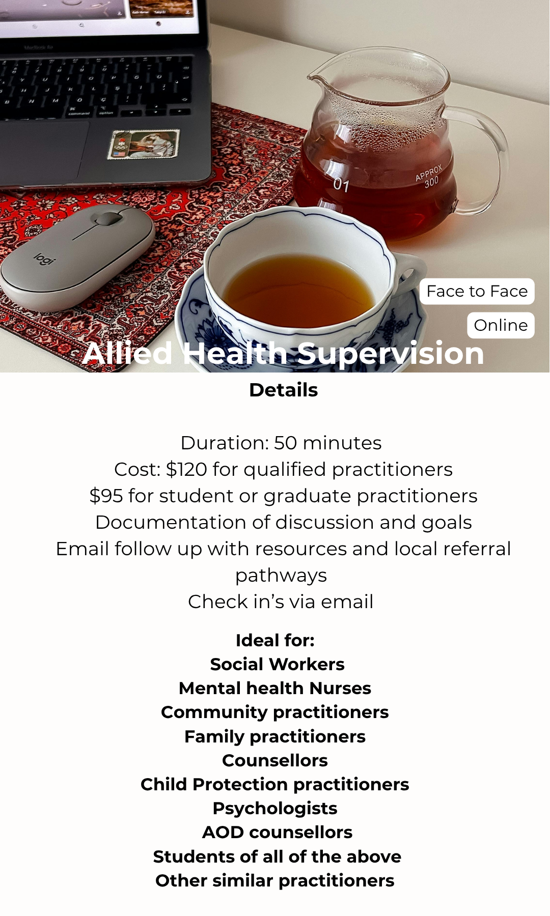 It offers an opportunity to explore complex client presentations, build confidence in decision-making, and deepen your professional skills within a safe and confidential environment. Supervision also supports ethical practice, encourages critical reflection, and helps you stay aligned with current standards and best practice.